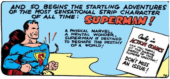 Each Superman storyline in the Action Comics series used to close with a message to the reader. The first read “And so begins the startling adventures of the most sensational strip character of all time: SUPERMAN! A physical marvel. A mental wonder. Superman is destined to reshape the destiny of the world!” and on a white square at the right side of the same panel the text said: “Only in Action Comics can you thrill at the daring deeds of this superb creation! Don’t miss an issue!” The panel was painted in the three dominant colors of 1930s comics: blue, red, and yellow (Figure 15). Superman is portrayed on the left, breaking a chain that was wrapped around his chest, demonstrating his superstrength. This panel was clearly designed as an advertisement for Superman and combined the intriguing and alluring text, while highlighting his most prominent attribute—strength.