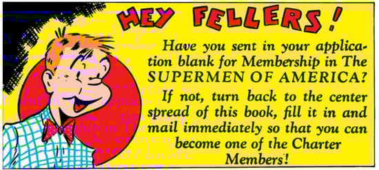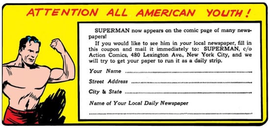 Thus, these panels were unique hybrids of narrative and advertisement, on the one hand, encouraging the audience to continue to read the comics, building a sort of hype around the new superhero and, on the other hand, urging the reader to get involved in the narrative itself. Many of these comics’ young readers might have wanted to look and become like Superman with his superhuman abilities. These closing panels, which were there from the first issues, tended to make these aspirations appear possible to some degree, probably helped with the promotion of the Superman narrative, and had a role in its rise to popularity. One might assume that if these panels did not work, they would not have been continued in subsequent issues and in the Superman series that followed. Thus, these panels, which combined text, illustrations, and advertisements, offer an interesting case study.