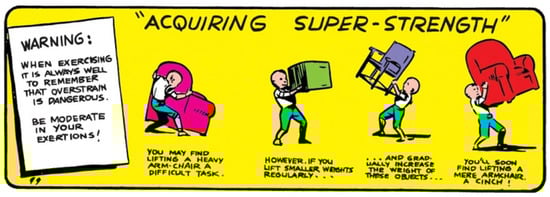 Along with the Hollywood influence, other media influenced the shaping of Superman’s image. The most prevalent aspect in the research field is the “Strongman” figure Siegmund Brietbart and the bodybuilding magazines (Andrae and Gordon 2010, pp. 55–61). It is well known that, owing to his shyness, from a young age Shuster started to build up his body to increase his self-confidence. He was often to be found in the school’s gym and continued to work on his fitness throughout his adult life, a fact that was noted, for example, in an issue of Saturday Evening Post in 1941. Addressing their new financial success, the journalist John Kobler wrote: “To Joe Shuster the most important thing money has bought is the chance to build up his body. For years he tried Lionel Strongfort correspondence school methods. … Now he lifts weights three times a week in Barney Kofron’s gym” (Kobler 1941, p. 76).