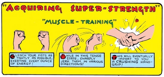 In the next issue, Superman once again displayed his physical attributes by showing off his biceps, while an advertisement announced the publication of the Superman comic strip in many newspapers and encouraged readers to subscribe to their local daily newspaper (Figure 16). Once again, the end panel was used to further the hype around the Superman comics. The third issue did not end with the figure of Superman but with a funny-looking boy with red hair, who reminded readers to subscribe to the “Superman of America” Society (Figure 17).17 The fourth issue showcased a charming panel of a boy trying to acquire superstrength by lifting small objects and building his strength gradually, while a warning text about being safe was featured on the left (Figure 18). This premise, known as “acquiring superstrength,” became a recurring motif, both in the Action Comics series and in the succeeding Superman comic book series, which was first published in 1939. For example, in the sixth issue of Action Comics, the “acquiring superstrength” title was followed by “muscle training,” which was demonstrated through illustrations picturing the way to use one’s fists to acquire muscles (Figure 19); in the eighth issue, a boy was depicted trying to acquire supervision with illustrations showing the exercises (Figure 20).