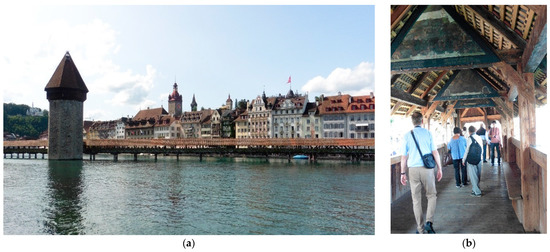 Other historical timber structures that deserve attention include a series of objects, such as bridges: Kapellbrucke in Lucerne (the oldest preserved truss bridge), built in 1333, with an original length of 270 m (Figure 1a,b), and the Rhinebridge in Schaffhausen from 1758 with an impressive single-span structure (Gerner 2002, p. 74).