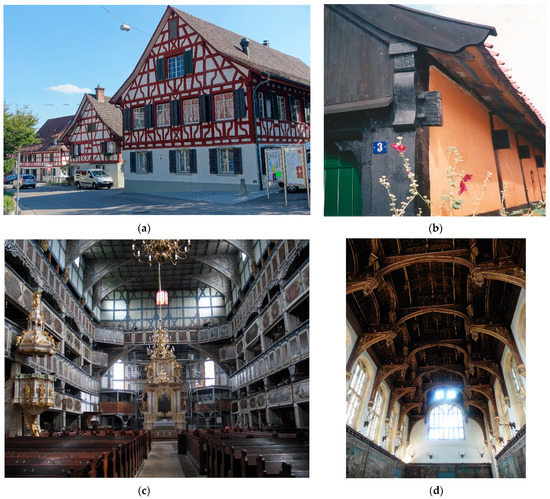 (a) Half-timbered buildings in the Swiss village Marthalen; photo: Joanna Arlet; (b) Svaneke (Bornholm) building with characteristic mortise and extended tenon joints; photo: Joanna Arlet; (c) rich ornaments inside the Church of Peace in Jawor; photo: Joanna Arlet; (d) Hampton Court Palace, Great Hall; photo: Joanna Arlet.