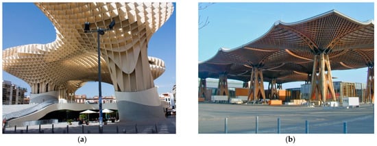 Innovative carpentry and hybrid connections can also be observed in objects of a varied functions and scales. A surprising, organic form is the hallmark of the Metropol Parasol at the Plaza de la Encarnación in Seville (Jodidio 2011, p. 18; Jodidio 2015, pp. 374–81). The main designer was Jürgen Mayer, an architect from the J. Mayer H. studio in Berlin. This openwork long-span box beam structure (with a modified half-lap joint), which is 150 m long, 70 m wide, and 28 m tall, was constructed in the year 2011 from cross-laminated timber. Its impressive dimensions make it one of the largest wooden structures in the world. Due to its unique shape, local residents nicknamed it Las Setas. Sculptural forms that resemble mushroom caps are supported by six reinforced concrete posts that also contain vertical communication shafts and fittings and are on steel structures inspired by the design of an umbrella (Figure 3a). They were the basis on which the wooden structure was mounted. An article about the realization of the Metropol Parasol by Carlos Marmol was published on the website Dario de Sevilla on 10 February 2010, entitled Un proyecto imposible.