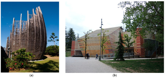 (a) Jean-Marie Tjibaou Cultural Centre in New Caledonia 1998; architect: Renzo Piano; source: Wikimedia Commons; (b) Auditorium in l’Aquila; architect: Renzo Piano; source: Wikimedia Commons.