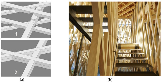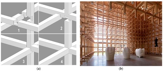 (a) The Chidori Joint GC Prostho Museum Research Center (2010), by Kengo Kuma; drawings: Piotr Arlet; (b) GC Prostho Museum Research Center; interior, photo: Daici Ano; Source: https://www.archdaily.com/199442/gc-prostho-museum-research-center-kengo-kuma-associates (accessed on 5 May 2021).