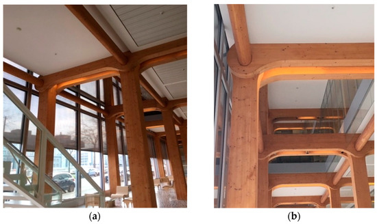 In the Tamedia Office Building in Zurich, erected in 2013, Shigeru Ban used an innovative combination of wood and glass (Schittich 2015, pp. 56–61). The shape and detail of the object, with its sparse form and balanced colors, perfectly match the surroundings and the architectural traditions of the city. The elements that play an important structural but also aesthetic role are the timber structure and the unique joints: “The wooden beams interlock, requiring no metal joints” (Architecture Pritzker Prize 2014) (Available online: https://www.pritzkerprize.com/announcement-shigeru-ban, accessed on 16 April 2021). They resemble pin joints or huge wooden hinges (Walker 2014). Furthermore their role is similar to that of tongs that embrace the construction posts (Figure 9a,b). The photo published in ArchDaily (Shigeru Ban Architects 2014) (Available online: https://www.archdaily.com/478633/tamedia-office-building-shigeru-ban-architects, accessed on 12 December 2019) allows us to take a peek inside the decorative joint, which is connected with a massive wooden pin and blocked. The whole seven-story wooden structure is connected with the roof, creating a kind of truss that surprises the viewer with its simplicity and the logic of the solutions applied.