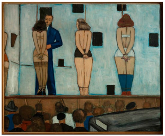 The first decade after World War II was a key period in shaping the artist’s worldview. As a result of the overwhelming experiences of the war, Nowosielski lost the religious faith he had taken from his family home. As he himself wrote: “I was a perfect atheist. So I didn’t believe in anything. Nothing but matter. Nothing beyond empirical experience” (Nowosielski 2013, pp. 424–27). The 1940s and the beginning of the 1950s were a time of internal struggle for the young artist. Pictures and drawings from this period are often dark, full of scenes of physical and mental violence, even of a sadomasochistic basis (Figure 2). Overwhelmed by the topics of sexuality and suffering that haunted him, Nowosielski was looking for an artistic escape. At the end of the 1940s, he discovered geometric abstraction for his painting, which he soon began to attribute spiritual content to: