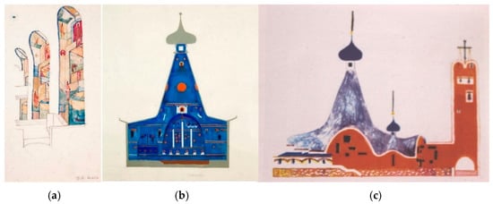 Jerzy Nowosielski: (a) conceptual sketch of the polychrome of the church at the Catholic University of Lublin, 1962. Photography by M. Gardulski/Galeria Starmach. Reproduced with permission. (b) The original color scheme of the Orthodox church in Hajnówka, 1972—interior (c) facade. Photography by M. Gardulski/Galeria Starmach. Reproduced with permission.