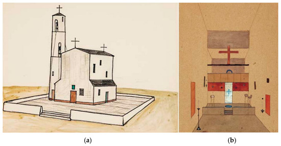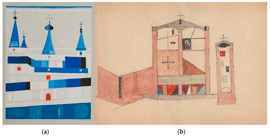 Jerzy Nowosielski throughout his life was keenly interested in architecture. He willingly drew existing and imaginary churches, transformed them in the spirit of abstraction, including architecture in the scenery of the “sacred space” in his paintings (Figure 7a). He was a connoisseur of early Christian, Byzantine, and old Russian architecture (Nowosielski 2013, pp. 91–97). Nowosielski was also familiar with modern architecture. In the late 1950s, he participated in the Artistic and Research Workshop (ZAB) at the Academy of Fine Arts in Warsaw and took part in experimental conceptual projects of new religious architecture in the team of Jerzy Sołtan, a close associate of Le Corbusier (Czerni 2018a, p. 191). It is not difficult to see a trace of these experiences in Nowosielski’s later architectural concepts. (Figure 7b). For instance, the “flowing” forms of the church in Hajnówka and the characteristic free arrangement of small openings in the gable walls resemble to some extent the forms of the Corbusier’s Ronchamp chapel.