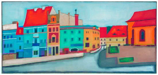 Nowosielski did not abandon figuration, however. Struggling with the recurring Manichean obsessions, the artist tried to transform his perception of empirical reality, “lifting it” to a spiritual level: “anticipating the resurrected reality, that is, a reality that exists more firmly, more confidently than the reality with which we have contact in our physical, biological experience.” (Nowosielski 2013, pp. 5–14). Searching for a suitable painting formula, he used the plastic language of the Ruthenian–Byzantine icon known from his youth. This inspiration allowed him to create an original painting style in which abstraction and figuration are combined into one vision. Having abandoned verism, the painter simplified the modeling, applied perspective distortions, and sharpened the colors. Characters, cities, and landscapes in his works became unreal, devoid of individual features, idealized and frozen in absolute peace. They were no longer representations of people and objects, but objects–symbols existing in a different, timeless sacred space (Figure 4). As the artist himself said: “Painting pictures is preparing a space in which we will have to live after death, it is building a dwelling for ourselves.” (Maciuszkiewicz 2018). Understanding Nowosielski’s work as a spatial phenomenon is key to capturing the essence of his activities in the field of architecture.