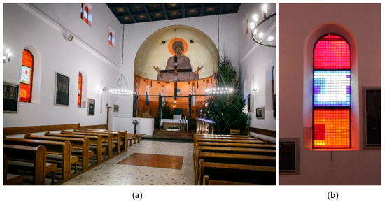 Roman Catholic Church in Wesoła: (a) overall view of the interior. Photography by Iwona Bal. (b) stained glass window. Photography by the author.