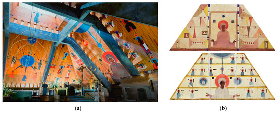 The polychrome in Tychy (1983–1986) is one of Nowosielski’s most spectacular projects (Figure 12a). The modern church of The Holy Spirit was built in the years 1978–1982 according to the design of Stanisław Niemczyk, in the form of an asymmetric pyramid, the roof of which rests on four trapezoidal reinforced concrete frames. The roof slope areas between the structural frames were lined with wooden paneling, which is the substrate for the polychrome. Nowosielski developed a rich iconographic program related to the name of the church, presenting, in the artist’s words, “Cosmic Pneumatophania, or the activities of the Third Divine Person in the entire historical area of the Economy of Salvation” (Nowosielski et al. 2003, p. 641). The central place above the altar wall is occupied by the figure of Mary Theotokos in the orans posture. The side areas are filled with great scenes of the Crucifixion and the Transfiguration. “I fill the remaining fields of the huge plane of the truncated pyramid with the great, medium and small figures of the God’s saints in all their diversity and individual uniqueness” (Nowosielski et al. 2003, p. 641).