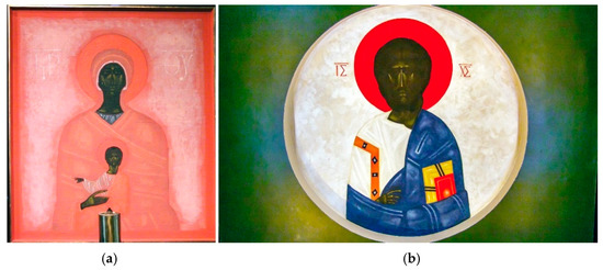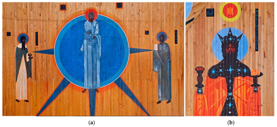 Church in Tychy—details of the polychromy: (a) Transfiguration; (b) Melchizedek. Photography by the author. Reproduced with permission.