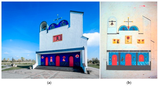 Jerzy Nowosielski: (a) “Church”, 1997 color serigraphy. Photography by M. Gardulski/Galeria Starmach. Reproduced with permission. (b) Project of the church in Sochaczew. Color scheme of the facade, 1958. Museum of Academy of Fine Arts, Warsaw. Reproduced with permission.