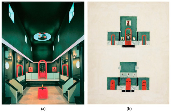 The spatial arrangement of the interior was inspired by the late antique patterns. The main space is a narrow and high main nave, covered with a flat ceiling with a small dome. The nave, preceded by a vestibule, is framed with low aisles and separated from the chancel by an openwork iconostasis. The nave floor is lowered in relation to the other parts of the temple and fenced off with massive balustrades, which may be a reference to baptismal basins in early Christian baptisms. This arrangement can also be read as a reminiscence of the ancient theatre—the aisles as theatron, the nave as the orchestra, the space in front of the iconostasis as a skene, and the iconostasis itself as a proskenion (Figure 14).