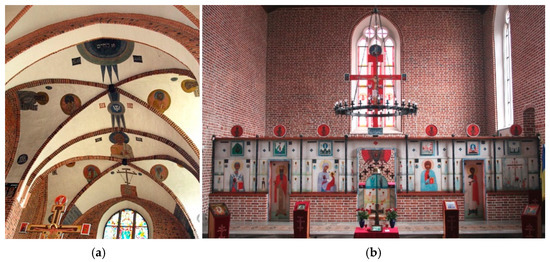 In Górowo Iławeckie in Masuria, the artist adapted an unused post-Evangelical aisleless church built in the Gothic style around 1367 (Kapka 2018). A characteristic feature of the existing interior were raw brick walls in a cool red color with a contrasting pattern of white joints. Nowosielski designed an iconostasis and polychrome of the walls (Figure 17b). The iconostasis was located on a plinth identical to the walls. The color scheme of paintings reflected the existing interior colors, but in inverted proportions: the dominant color is white contrasted with red elements—small circular icons and a cross crowning the iconostasis, as well as a large halos that is a part of the Mandylion on the back wall of the chancel. The palette is complemented by sparingly dosed blues, yellows, and browns of saints’ complexions. The project in Górowo Iławeckie shows Nowosielski’s extraordinary abilities to use the existing qualities of the interior. Thanks to this, he was able to achieve spectacular artistic effects with modest means.