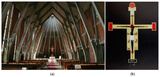 St. Dominic church in Warsaw: (a) overall view. Photography by Traper Bemowski. Image in the public domain. (b) The altar cross-designed by Jerzy Nowosielski. Photography by the author.