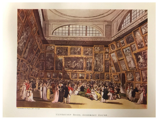 Thomas Rowlandson and Augustus Charles Pugin, Exhibition Room, Somerset House, 1 January 1808. Aquatint and etching, 194 mm × 259 mm, Royal Academy of Art. Engraved by John Hill. Published by Rudolph Ackermann in Microcosm of London, London: R. Ackermann, 1808–10, vol. I, pl. 2. Photographer Julie Codell.