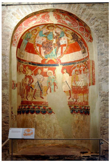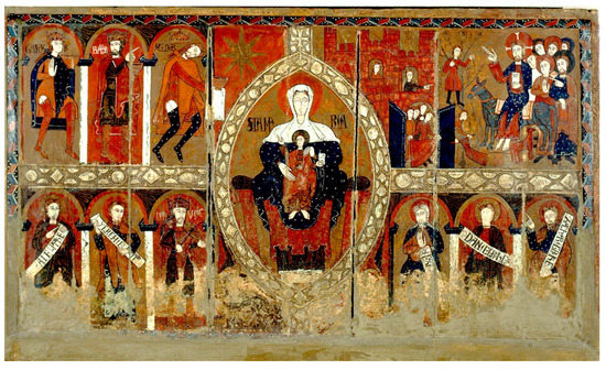 As far as the dating of the paintings is concerned, it is important to take into account the following guidelines. Historically, the wall paintings of Santa Maria of Terrassa have been attributed to the Master of Espinelves (Kuhn 1930; Cook and Gudiol i Ricart 1950, pp. 91–92), a painter associated with Vic and named after the altar frontal at Espinelves (c. 1187), now in the Episcopal Museum of Vic (Figure 12). This altarpiece was probably made towards the end of the twelfth century to complete the church, which had been restored and reconsecrated in 1186.