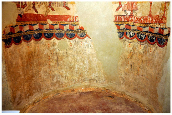 The three registers of the paintings are separated by two wide strips, which originally bore two inscriptions that are partially lost. A third inscription embellished the curtains of the lower register (Figure 5). The outlines of some letters can still be seen, giving the date of Becket’s death, December 29: ‘THOMAS (…) IIII·K(alendas)·IANVARII’. The third inscription is located just below the scene of the martyrdom: ‘[TH]OMA BO[NORUM] (damaged area) [NV]S S(an)C(t)A PLVS VALET ARTE SUA’.5 Finally, in the folds that form the curtains, a third epigraph is partially preserved: ‘PRO XR(ist)O…… SPOLIARI NON DUBITAVIT VIVIT QVM (damaged area) [THO]MAS QUE(m) SEMP(er) AMAVIT’ (Guardia 1998–1999).6