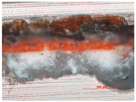 Sample from the remaining mecca gilding of the chandeliers in the upper register. The microscopic image shows four layers: a first layer of translucent brown lacquer or organic resin, a grey metal layer, a red layer (pictorial layer) and finally, the white forth stratum is the preparation layer.