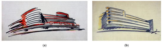 It is Mendelsohn who should be seen as a precursor of modern German interwar commercial buildings. In his firm, which operated in Berlin in the years 1919–1933, he created still-astonishing, expressive conceptual sketches, which he then turned into technical designs of department stores that had avant-garde architecture (Figure 1a,b).
