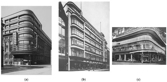 (a) The Mossehaus in Berlin, remodelled by Erich Mendelsohn in 1924 () (b) The Pelzhaus C.A. Herpich & Sons at 9–13 Leipziger Straße in Berlin, remodelled in 1924–1927, arch. Erich Mendelsohn (); (c) The Waeschekaufhaus F.V. Grünfeld at Kurfurstendamm Berlin, 1928 ().