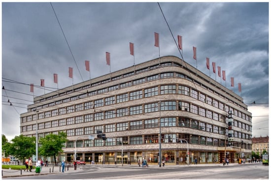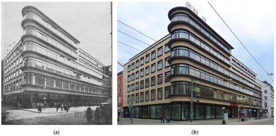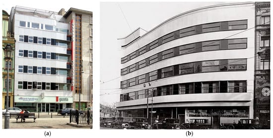 This gained him the reputation of an outstanding Modernist, and the few surviving buildings that he designed are currently seen as priceless monuments (; ). Mendelsohn’s first achievement was the reconstruction of the Mossehaus, which belonged to the publisher of the Berliner Tagesblatt (Figure 2a). The building had been damaged during revolutionary unrest in November 1919. Mendelsohn left the remaining fragments of sandstone facades and changed the structure of the corner, above which he created a rounded, three-storey, plaster-covered superstructure that descended in steps on both sides, which gave the building a futuristic appearance. The architect also innovatively introduced cladding from dark, glazed ceramic tiles near the interior. The tiles were produced by Richard Blumenfeld AG in Velten, and had black, pronounced cornices (, ). On the upper floors, a stunning effect was produced by window strips with recessed frames, a feature which had been previously only used in industrial buildings (). Erich Mendelsohn also authored the avant-garde remodelling of the Pelzhaus C.A. Herpich & Sons at 9–13 Leipziger Straße, which was carried out in 1924–1927 (Figure 2b). The new building, erected at the site of three residential buildings, became a uniform structure, whose Functional facade, featuring horizontal window strips and bright travertine walls, was enhanced by flat oriels and cornices from gleaming brass. This solution was quickly acknowledged as a model for commercial buildings erected in the Neue Sachlichkeit and Streamline Moderne styles. It is telling that the project’s completion was delayed by several years, which resulted from a lack of proper regulations, as well as the torpedoing of this innovative architecture by municipal authorities (; ).