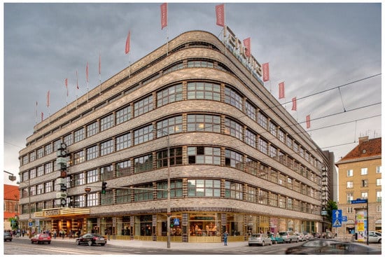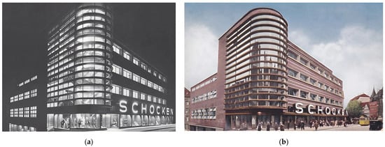Erich Mendelsohn, having the achievements of prototypical commercial buildings behind him, engaged in completing three department stores for the Schocken company in the years 1926–1928: in Nurnberg, Stuttgart and Chemnitz. By designing the distinctive forms of these buildings, which were used in the advertisements of the company and entrenched its image, Mendelsohn became a precursor of branding in architecture (). The building in Stuttgart specifically deserves a detailed overview, as it is seen as an icon of the Streamline style. Due to its five-storey steel skeleton structure, the building had an open interior structure, enhanced with insolating courtyards. The facades were designed as predominantly horizontal due to strips of windows that varied within the facade and were framed by cornices from bright-beige Connstatter Travertin stone from the Harz Mountains () and sill walls that were clad in glazed clinker which featured numerous shades of brown and red (Figure 4a,b) (; ; ). It is believed that this type of material, aplied in commercial buildings, as well as the vivid building illuminations, must have been seen by Mendelsohn during his travels in buildings by Henry van der Velde in Belgium and Frank Lloyd Wright in the US. The corner section of the department store, which housed a formal staircase, formed a rounded tower that was held by cantilevers over 3.5 m above the ground floor, with expressive divisions formed by brass cornices and continuous strips of glazing. The other Schocken buildings also gained recognition. The building in Chemnitz was especially praised for the boldness of its cantilever structure, which was closely linked with the spacing of internal columns and the facade which featured balanced relations between the horizontal layout of windows and prominent staircase shafts. The skilful reduction of the building’s mass by setting back the upper floor was also praised ().