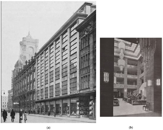 (a) The Kaufhaus N. Israel at 9/10 Königstraße 1927, arch. Heinrich Straumer (); (b) Lichhof of the Kaufhaus N. Israel, Berlin, 1927 ().