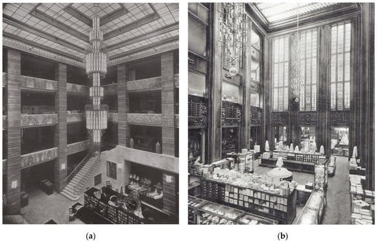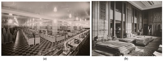 The key to the commercial success of large department stores from the period under study were large retail halls, wherein each department was to be optimally placed by generating layouts and décor that addressed their specificity. In the Wertheim department store, such halls, with a clearance height of almost 5 m, were distributed across four floors around the two courtyards. Support spacings that ranged from 10.5 to 13.8 m ensured that the interiors were legible. The columns, structural beams and ceilings were covered in plaster and painted white. The halls were filled with simple, glazed furniture that stood on wooden flooring. Only the grocery department used red-white checkerboard-pattern ceramic floors, and the columns were clad in two-coloured ceramic panels oriented into horizontal strips (Figure 18a). An exceptional décor of walls lined with Caucasus walnut wood and original illumination via an elongated ceiling dome could be encountered in the carpet department (Figure 18b). Bespoke interiors could also be found in the service facility, e.g., in the hair stylist salon, where cherry wood was used both to line the walls and make furniture. A formal restaurant hall for 400 guests located on the fifth floor, designed by E.M. Lesser, had a ceiling with facets decorated with mouldings and lining from Makassar ebony wood ().