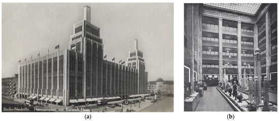 (a) The Karstadt store at Hermannplatz Berlin 1927–1929, arch. Philip Schaefer (Archival postcard); (b) Lichhof of the Warenhaus Karstadt ().