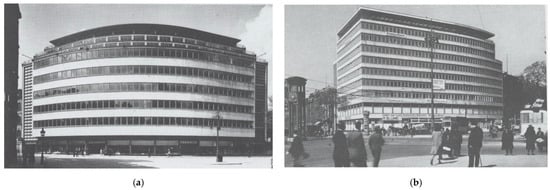 (a) The Warenhaus Schocken, Chemnitz 1928, arch. Erich Mendelsohn (); (b) The Columbus House (a modified design of Galerie La Fayette) Leipziger Platz, Berlin 1928–1933, arch. Erich Mendelsohn ().