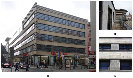 Mendelsohn experimented with just such a structure in Breslau in 1927, yet with a completely different form and facade material. He received a commission to remodel the Rudolf Petersdorff Konfektionshaus that had existed there since 1913. The project was tied with the building’s extension on the corner of Szewska and Oławska streets. Due to the use of a steel structural skeleton on the building’s six repeatable floors, open space interiors were formed, allowing for the arrangement of a fashion gallery, as well as offices and sewing halls on the upper storeys. In the wider facade from the side of Szewska Street, three floors were suspended by cantilevers above the ground floor, which featured enormous display windows and a glazed main entrance. The design was predominated by an alternating layout of window streets with brass frames, framed with pronounced brass cornices and sill walls from bright beige slabs of Connstatter Travertin stone (Figure 5a,b and Figure 10b). (; ).