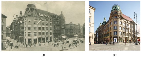 (a) The Warenhaus Gebrüder Barasch, its facade remodelled in the years 1928–1930, design by Simon & Halfpaap (Archival postcard); (b) The PSS Feniks department store (the former Barasch), after a renovation performed in 2004. Photo by Paweł Kirschke.