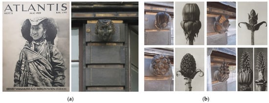 Floors between the first and the fourth had a unified composition, generated by horizontal wall strips with bright pastel colours, divided by dark brown cornices made from thick-walled panels with fine, white quartz grains, whose undersides were gilded. Wooden windows were placed between lesenes clad with strips of dark-brown, large-format ceramics and narrower, recessed panels, which were gilded. On the four levels, the upper section of each lesene featured a ceramic human head of supernatural size or a full-figure finial. The sculptures, numbering 156 in total, were made by Ulrich Nitschke and Hans Klakow. In 1929, Nitschke was commissioned to make 25 heads, forming a cycle entitled Type aus aller Herren Länder, and was to make four copies of each. The heads were modelled after photographs of people of various races presented on the pages of the Atlantis magazine (Figure 15a) (). The finials, placed on the facade in a vertical layout every three axes, were inspired by pioneering macroscopic plant photographs by sculptor Karl Blossfeldt, which were first published in 1929 (Figure 15b) (). All of the sculptures were made from the same clinker clay as the other ceramic elements. They were dried and later fired two times (the last firing was performed after applying the glazing). Afterwards, gilded accents were applied—on the heads they typically covered the hair and beards in the case of male heads—and the edges of finials (Figure 15a and Figure 16a,b).