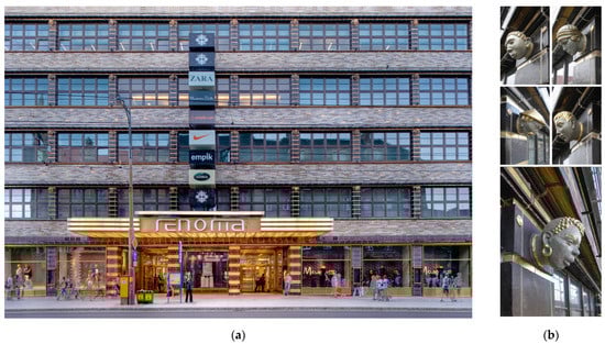 The Renoma Department Store (formerly the Wertheim department store), western facade after renovation to a design by MPP, arch. Zbigniew Maćków 2009, conservation design by arch. Krystyna Kirschke and Paweł Kirschke, sculptures recreated by artist Paulina Zięba. (a) Central part of the facade and main entrance Photo by Juliusz Sokołowski. (b) Fragments of floors 1 to 3–interwindow lesenes and ceramic head sculptures. Photo by Paweł Kirschke.