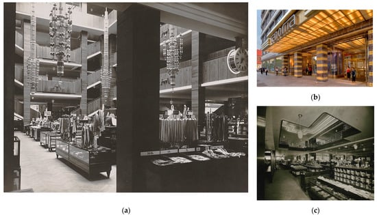 The building’s central courtyard was exceeding high, and the pilasters that formed it were clad in Muschelkalk stone (Figure 8b). Its glass roof had a simple, horizontal layout. The building had a majestic character, which was not disrupted by advertisements typically seen in such buildings. Here, they were confined to the store’s name placed above the entrance and on the towers. The sole colour-based accent of this monochromatic composition consisted of flags placed at the building’s top. The building had an illumination that highlighted the verticality of its facades and strongly accentuated the stepped tower pinnacles that were designed in the spirit of Art Deco. It should be added that this Karstadt store had an entire array of then-cutting-edge and unique technical solutions, such as an enormous rooftop strolling terrace with greenery and lanterns, as well as a U-Bahn station in its cellars ().