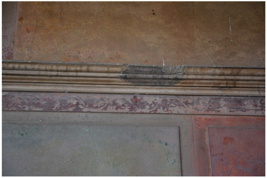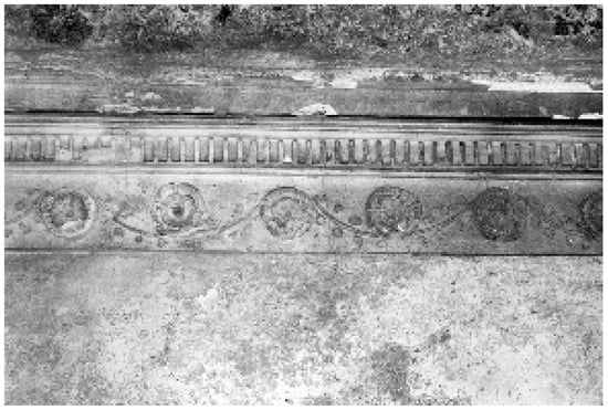 Only in very rare cases three-dimensional friezes were integrated into the wall—e.g., metope-triglyph friezes or rosette friezes (see below, Figure 7).24 A real light–shadow effect is also achieved through the three-dimensionality of the designed stucco surface. Rarely are light and shadow—and thus three-dimensionality—created by colours. This is especially true for painted architectural elements, such as friezes and coffered ceilings.25 The Tuscan atrium of the Protocasa del Granduca Michele (VI 5,5) possesses this type of decoration. With a painted dentil cornice and a perspective-painted coffered ceiling with a central rosette motif, illusionistic elements were introduced into the wall decor (Figure 3). Imitation using paint provided these areas with special sophistication, as lighter and darker colour values created the illusion of light and shadow.