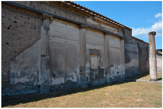 | 55 | Staub-Gierow (1994, p. 65 f.); Staub-Gierow (1997, p. 91 Figure 41); Laidlaw (1985, pp. 251 f. Figure 65); Oriolo and Zanier (2011, 488 f. assign the decorative elements of the first style to a redesign in early Augustan times); furthermore the western rear wall of peristyle (y) of the Casa di M. Epidius Sabinus (IX 1,22.29) also features half columns; see Sampaolo (1998, pp. 994–96, Figure 69). |