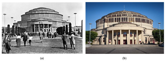 Centennial Hall built in 1910–1913, designed by Max Berg: (a) during the Centennial Exhibition in 1913, Dekorative Kunst, 1912–1913, p. 537; (b) after renovation in 2009, contemporary view (photo M. Kulczyński).