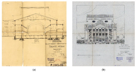 The theater (Metropol, later Schauspielhaus, and today Teatr Polski), built in 1905–1908 and designed by Berlin architect Walter Hentschel: (a) cross-section and (b) front elevation (Wrocław Construction Archive, a branch of the Museum of Architecture in Wrocław).