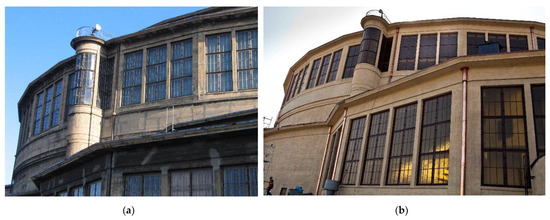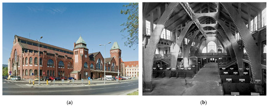 The Market Halls (Figure 3), dating from 1907 to 1908, were among the first in Europe to use reinforced concrete structures of parabolic arches with a span of 19 m. Richard Plüdemann and Heinrich Küster (Gryglewska 2008) left the concrete inside in an almost “pure” form, not hiding the texture under a layer of plaster. Only a modest polychrome with floral motifs was made on the underside of the arches. The buildings still had the traditional external “costume”. The facades of the halls represented historicist architecture, while the interiors foreshadowed the architecture of the famous Centennial Hall by Max Berg, with their concrete parabolic arches reminiscent of the dome and monumental arches of the Centennial Hall.