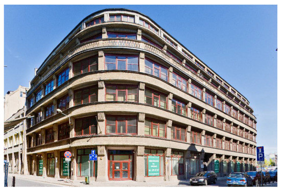 Hans Poelzig’s office building (Figure 4) was already modern in both interior and façade design. The office building foreshadowed the department stores and metropolitan architecture designed in the 1920s by, among others, Erich Mendelsohn. It was also the first reception in Europe of American architecture of the so-called Chicago school, which developed in the United States at the turn of the 19th and 20th centuries. Poelzig’s building is compared to an icon of 20th century architecture—Walter Gropius’s Fagus factory in Alfeld an der Leine.