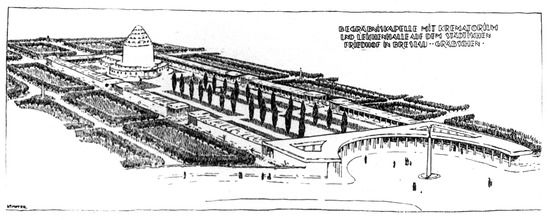 Funeral chapel with crematorium and mortuary designed by Max Berg, in the municipal cemetery in Breslau Gräbschen (Deutschland Städtebau Breslau, Berlin, 1921, p. 41).