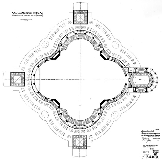 Centennial Hall, plan of second floor and galleries, developed in August 1911 and approved by the Municipality of Wrocław on 25 September 1911 (Wrocław Construction Archive, a branch of the Museum of Architecture in Wrocław).