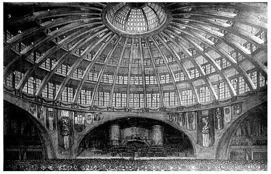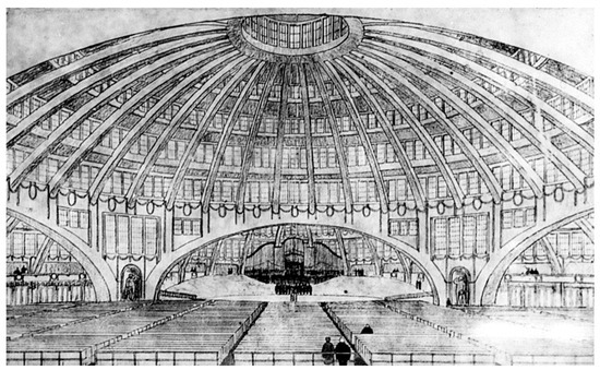 The authors writing about the hall pointed out the span of the dome, which was greater than the scale of all the earlier domes of historical buildings (the Pantheon, the Hagia Sophia, or St. Peter’s Basilica) and gave numerical data and basic information about its construction, but few stressed the significance of the building for the development of modern architecture, and few analyzed its relationship to the work of other architects of the time (Vischer and Hilberseimer 1928; Müller-Wulckow 1929; Schumacher 1935; Joedicke 1958; Roh 1958; Tintelnot 1959; Thiele 1963; Arnason 1970; Lampugnani 1999; Scheyer 1984; Hersel 1987). Werner Hofmann saw the hall as a futuristic work and compared it to Giacomo Balla’s painting Mercury Passing by the Sun (Hofmann 1980, p. 423). Henry-Russell Hitchcock very accurately connected Berg’s work with Friedrich von Thiersch’s hall in Frankfurt on Main, built in 1907–1908. As a work of engineering, the hall in Wrocław refers to the great station halls of Stuttgart and Karlsruhe (Hitchcock 1987).