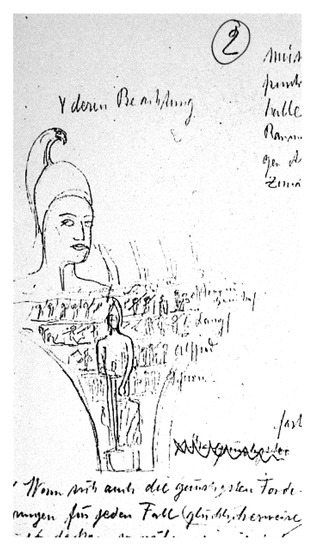 In May 1914, Oskar Kokoschka received from Max Berg the finished designs of the crematorium, made back in 1912, and at the same time an invitation from the city authorities to come to Breslau. In a letter to Alma Mahler, he wrote: “Today I received the plans for the crematorium and a letter from Berg in the form of an official invitation. He is a true lover of art, who does not wait for the effect, but helps to make it a reality” (Kokoschka 1984). Around 23–24 May 1914, Kokoschka was in Breslau to conduct negotiations on the frescoes for the crematorium (Kokoschka 1984; Strobl and Weidinger 1994). The surviving drawings show that he made sketches of the frescoes in two stages: May–July and fall 1914 (Spielmann 1992–1993). The three cartons from November 1914, now stored in Dresden, and some drawings from the collection in Vevey, also indicate that Kokoschka was not only interested in painting but also made architectural drawings (Figure 12). In November 1916, in a letter to his parents, he mentioned that during a meeting with Berg and his wife in Berlin, he showed his architectural designs for the crematorium. Berg praised him for his courage and good idea, then took these sketches to make technical drawings based on them in his office in Breslau (Kokoschka 1984).