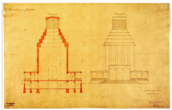 Berg probably gave Kokoschka a version of the crematorium that corresponds with the design from July 1914, which can be found in the Wrocław Museum of Architecture (a branch of the Wrocław City Building Archive) (Figure 13). It shows the building set on a square or rectangular plan (the projection has not survived) with a centrally located tower chapel, surrounded by a courtyard and columbarium cloisters open to the outside. The whole is set on a high and massive 1.60 m high pedestal. From the front elevation, facing west, the main alley of the newly established cemetery led towards today’s Grabiszyńska Street. The entrance to the funeral chapel was preceded by a four-column portico, to which stairs led. The elevation was divided vertically by pilaster strips or half-columns in the great order. The chapel had the shape of a simple cylinder or cuboid, which narrowed in five steps from the middle of its height. A roof lantern rose above the narrow part. According to the project’s dimensions, it was to be a monumental building with the diameter of funeral chapel being about 14 m and the base width being about 29 m; the height of the entire building was to be 32.80 m (Figure 14a).