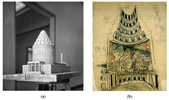 The crematorium design by Max Berg: (a) model (Deutsches Museum in Munich); (b) painting decoration design by Oscar Kokoschka, 26 November 1914 (Staatlichen Kunstsammlungen Dresden, after http://www.7cudow.eu/pl/eksponaty/max-berg-oskar-kokoschka-niezrealizowany-projekt-krematorium-na-cmentarzu-grabiszynskim/, accessed on 27 November 2021).